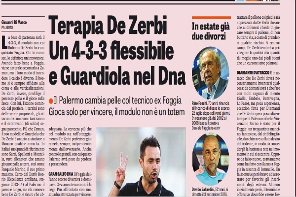 “La base di partenza sarà il 4-3-3, il modulo con cui Roberto De Zerbi ha conquistato Foggia. Chi lo conosce, lo definisce un innovatore. Avendo fatto bene a Foggia, viene naturale accostarlo a Zeman, ma il loro modo di intendere il calcio è diverso. Il boemo si è sempre affidato alla corsa e alle verticalizzazioni. De Zerbi, invece, predilige il possesso palla e il gioco sulle fasce. Con lui, l’azione comincia dal portiere, i terzini sono delle vere e proprie ali, gli attaccanti si muovono tantissimo e il centravanti (di solito) segna parecchio. Più che Zeman, il suo modello è Guardiola che De Zerbi è andato a studiare a Monaco qualche anno fa. In Italia i suoi punti di riferimento sono Sarri, Spalletti e Montella, tutti allenatori che amano giocare palla a terra, così come Pasquale Marino, il suo primo maestro. Certo dal Darfo Boario (Eccellenza emiliana, stagione 2013-14) al Palermo il passo è lungo, ma chi conosce bene De Zerbi è sicuro che abbia le caratteristiche necessarie per sfondare anche in A. Avrà bisogno di tempo, questo è ovvio, ragion per cui se Zamparini vorrà raccogliere i frutti della sua intuizione, deve sforzarsi di avere pazienza.