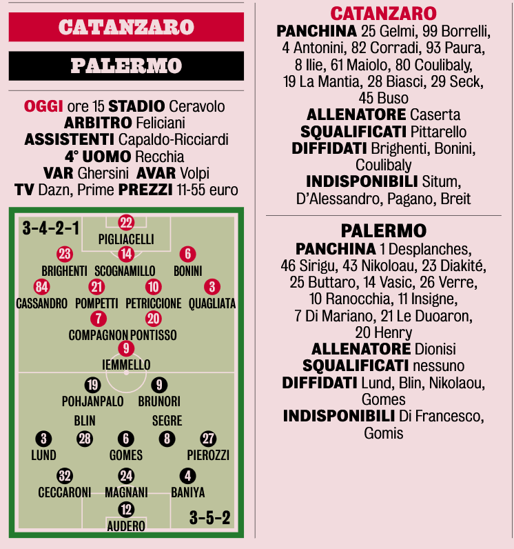 Si alza la tensione al “Ceravolo”, dove oggi pomeriggio Catanzaro e Palermo si sfidano in quello che è a tutti gli effetti il primo spareggio in chiave playoff. Come riporta la Gazzetta dello Sport, i calabresi si preparano a schierare Compagnon e Brighenti, favoriti per una maglia da titolari rispettivamente su Biasci e Antonini.