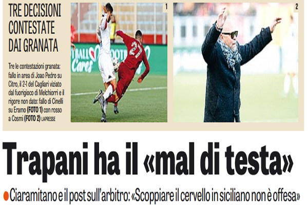 Gazzetta dello Sport: “Trapani ha il «mal di testa». Ciaramitaro e il post sull’arbitro: «Scoppiare il cervello in siciliano non è offesa»”