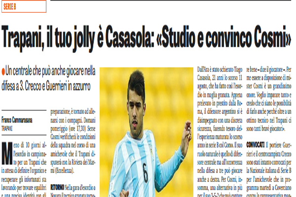 Gazzetta dello Sport: “Trapani, il tuo jolly è Casasola: «Studio e convinco Cosmi»”
