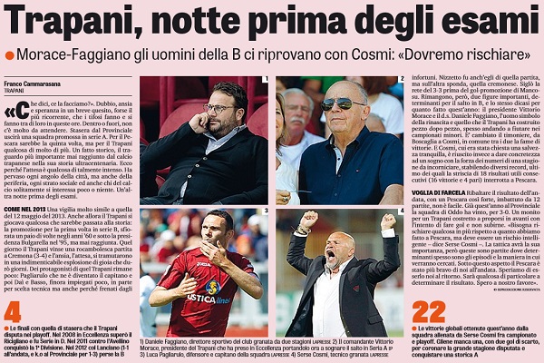 Gazzetta dello Sport: “Trapani, notte prima degli esami. Morace-Faggiano gli uomini della B ci riprovano con Cosmi: «Dovremo rischiare»”
