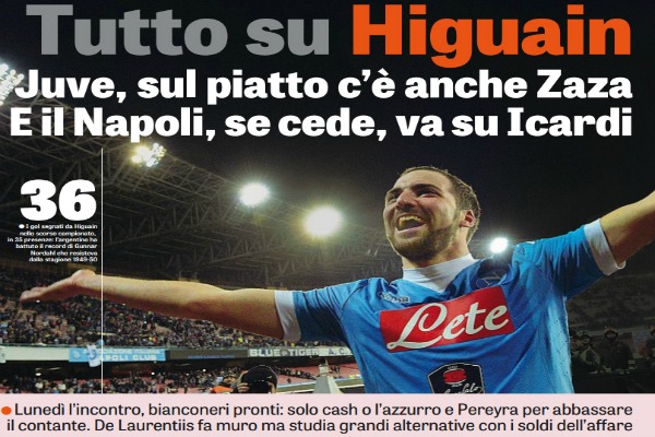 “La Dimaro azzurra si è svegliata ancora incredula e col magone. Gonzalo Higuain–Juventus è un binomio che nessun tifoso del Napoli avrebbe mai voluto sentire. Eppure, dopo tanto rumore, spifferi e sondaggi, la trattativa è passata da «suggestione» ad «affare caldo», quasi clamoroso. La Juve passerà il weekend a mettere a punto nei minimi dettagli la strategia per l’affondo decisivo, per presentarsi all’assemblea di Lega di lunedì a Milano – e quindi all’appuntamento con il presidente del Napoli Aurelio De Laurentiis – con tutte le soluzioni possibili per mettere a segno il colpo dell’anno.