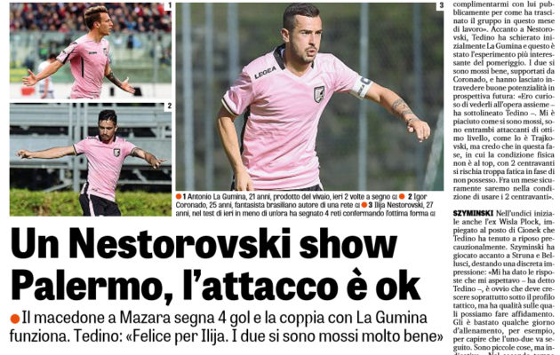 “Nestorovski c’è. A una settimana dall’inizio del campionato, ieri contro il Mazara il macedone si è preso la scena: 4 gol in 50 minuti. Certo, quello contro i gialloblu di Brucculeri non può essere considerato un test proibitivo, ma – come si dice in questi casi – segnare per un attaccante è sempre importante, pure in allenamento, e per Nestorovski forse lo è stato anche un po’ di più, considerato che era rimasto all’asciutto nelle prime due uscite ufficiali, contro Virtus Francavilla e Cagliari in Coppa Italia. Il macedone è entrato in campo determinatissimo, mettendo a segno 3 gol in 13 minuti: «Voglio complimentarmi con lui pubblicamente per come ha trascinato il gruppo in questo mese di lavoro». Accanto a Nestorovski, Tedino ha schierato inizialmente La Gumina e questo è stato l’esperimento più interessante del pomeriggio. I due si sono mossi bene, supportati da Coronado, e hanno lasciato intravedere buone potenzialità in prospettiva futura: «Ero curioso di vederli all’opera assieme – ha sottolineato Tedino –. Mi è piaciuto come si sono mossi, sono entrambi attaccanti di ottimo livello, come lo è Trajkovski, ma credo che in questa fase, in cui la condizione fisica non è al top, con 2 centravanti si rischia troppa fatica in fase di non possesso. Fra un mese sicuramente saremo nella condizione di usare i 2 centravanti». […]”. Questoq aunto riportato da “La Gazzetta dello Sport”.