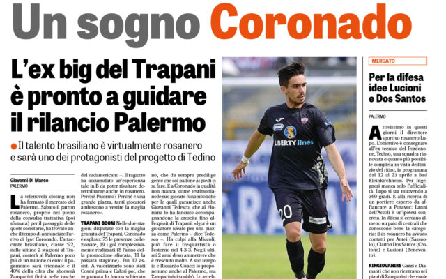 Gazzetta dello Sport: “Un sogno Coronado. L’ex big del Trapani è pronto a guidare il rilancio del Palermo”