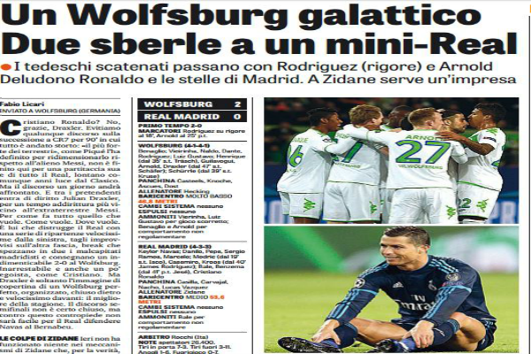 Gazzetta dello Sport: “Un Wolfsburg galattico. Due sberle a un mini-Real”