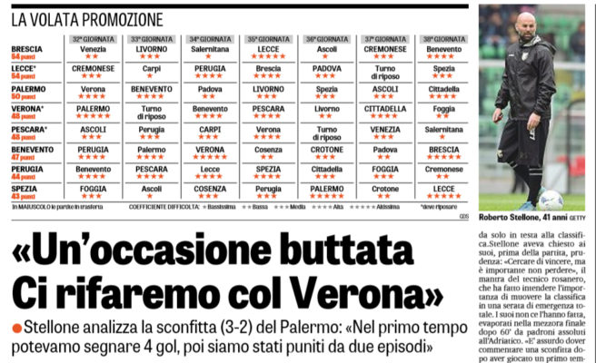 L’edizione odierna del “Giornale di Sicilia” sottolinea il rammarico dei rosanero dopo la rocambolesca sconfitta di Pescara. Il tecnico Stellone ha affermato: «La partita l’abbiamo fatta noi, come dovevamo farla. Abbiamo giocato un ottimo primo tempo, c’è stata una grande reazione dopo il loro primo gol. E potevamo andare avanti sul 3 a 1 o addirittura sul 4 a 1. Nella ripresa è vero che abbiamo avuto meno occasioni, ma ci sono state delle ripartenze per fare male al Pescara. Quel tiro di Memushaj sotto al sette è stato un episodio.Un gol nel finale, da angolo, ha deciso la partita. Ci