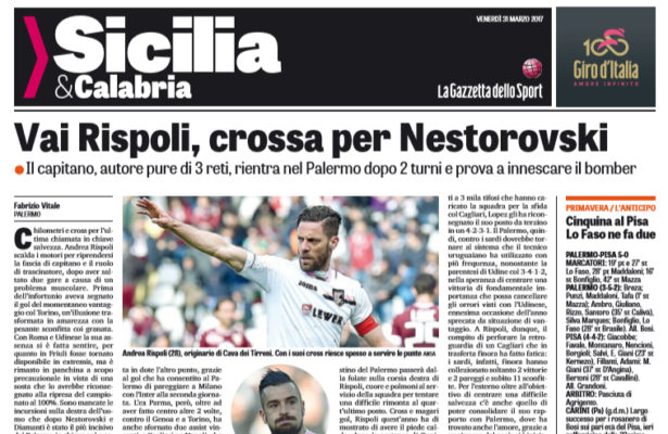 Gazzetta dello Sport: “Vai Rispoli, crossa per Nestorovski. Il capitano, autore pure di 3 reti, rientra nel Palermo dopo 2 turni e prova a innescare il bomber”
