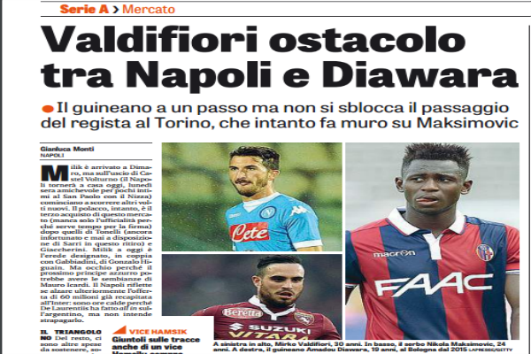 IL TRIANGOLO NO Del resto, ci sono altre spese da sostenere, soprattutto per rinforzare il centrocampo. Giuntoli ha messo le mani su Diawara del Bologna e lo sta per portare a casa per 15 milioni più due di bonus (pagamento triennale). Prima, però, il direttore sportivo del Napoli deve venire a capo di una situazione intricata che riguarda almeno altri tre calciatori (Maksimovic, Valdifiori e Koulibaly) e due squadre (Torino e Chelsea). Per Diawara restano da limare solo i dettagli dell’accordo con il calciatore (quinquennale da un milione di euro a salire), ma paradossalmente l’ostacolo maggiore è il Torino e non l’ex dirigente azzurro Bigon (adesso sul ponte di comando a Bologna). In pratica, il Napoli vuole Diawara come sostituto di Valdifiori, richiesto dal club granata che ha offerto quattro milioni ma che è pronto a virare su altri obiettivi. Il Napoli non solo valuta l’ex empolese sei milioni ma vorrebbe inserirlo nella trattativa con il Toro per Maksimovic così da mettere sul piatto una cifra totale di 25 milioni (19 cash cui aggiungere appunto il cartellino di Valdifiori). Il club granata fa muro perché non ha intenzione per adesso di privarsi di Maksimovic che Mihajlovic ritiene fondamentale. Tuttavia, il Napoli non sembra intenzionato a chiudere per Diawara finché non uscirà Valdifiori.