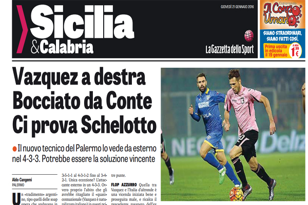 Gazzetta dello Sport: “Vazquez a destra bocciato da Conte, ci prova Schelotto. C’è un europeo da conquistare”
