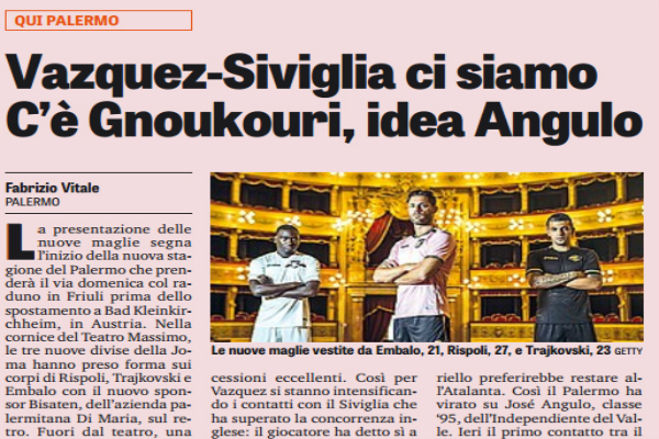 “La presentazione delle nuove maglie segna l’inizio della nuova stagione del Palermo che prenderà il via domenica col raduno in Friuli prima dello spostamento a Bad Kleinkirchheim, in Austria. Nella cornice del Teatro Massimo, le tre nuove divise della Joma hanno preso forma sui corpi di Rispoli, Trajkovski e Embalo con il nuovo sponsor Bisaten, dell’azienda palermitana Di Maria, sul retro. Fuori dal teatro, una trentina di tifosi della curva Nord inferiore ha contestato il presidente Zamparini, in questo momento impegnato con il nuovo d.s. Foschi sulle cessioni eccellenti. Così per Vazquez si stanno intensificando i contatti con il Siviglia che ha superato la concorrenza inglese: il giocatore ha detto sì a 5 anni di contratto a 2 milioni a stagione, chiusura vicina a 15 milioni (si discute solo sulle modalità di pagamento). Si lavora anche per l’attacco. Borriello preferirebbe restare all’Atalanta. Così il Palermo ha virato su José Angulo, classe ‘95, dell’Independiente del Valle. Ieri il primo contatto tra il d.s. Foschi e l’entourage dell’attaccante ecuadoriano. Intanto in mezzo è sorpasso sul Bologna per Gnoukouri”. Questo quanto riportato dall’edizione odierna de “La Gazzetta dello Sport”.