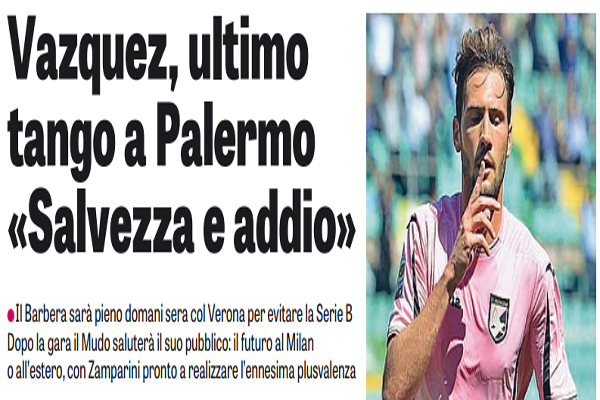 Gazzetta dello Sport: “Vazquez, ultimo tango a Palermo «Salvezza e addio». Domani Barbera pieno per evitare la B, poi il Mudo saluterà il suo pubblico: il futuro al Milan o all’estero, con Zamparini pronto a realizzare l’ennesima plusvalenza”