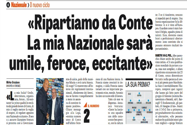 Gazzetta dello Sport: “Ventura: «Ripartiamo da Conte. La mia Nazionale sarà umile, feroce, eccitante»”
