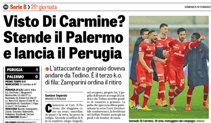 “Clamoroso al Curi. Il Palermo che viaggiava come un treno, rastrellando punti e la vetta, ha perso la valigia. Seconda sconfitta di fila in trasferta (dopo Empoli), intervallata dalla scoppola col Foggia al Barbera. Tre batoste infila.«Periodono», dice Tedino, evidentemente la pensa come lui Zamparini che ordina il ritiro punitivo: da domani tutti a Coccaglio. I PROTAGONISTI Lo stop di Perugia pesa e ha una triplice lettura: la vendetta degli umbri dopo la sconfitta dell’andata (immeritata, con episodi da Vara penalizzarli), un primo tempo rosanero da schiaffi (sterile, attendista, come se si delegasse tutto alla ripresa e all’assalto finale), oltre a scelte che lasciano perplessi con un assetto spuntato dove il Palermo, in B, non vince da oltre 70 anni. Decide tutto Di Carmine, nel recupero, proprio lui, il pupillo di Briatore ai tempi di Londra e che Tedino avrebbe gradito in rosanero a gennaio. La palla che spacca la difesa palermitana la serve Cerri (irriducibile combattente), la freddezza nel beffare Pomini uscitogli sui piedi è da bomber di razza. […]”.