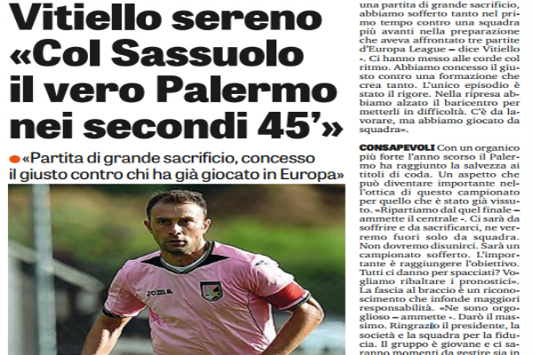 Gazzetta dello Sport: “Vitiello sereno: «Col Sassuolo il vero Palermo nei secondi 45’. Partita di grande sacrificio, concesso il giusto contro chi ha già giocato in Europa»”