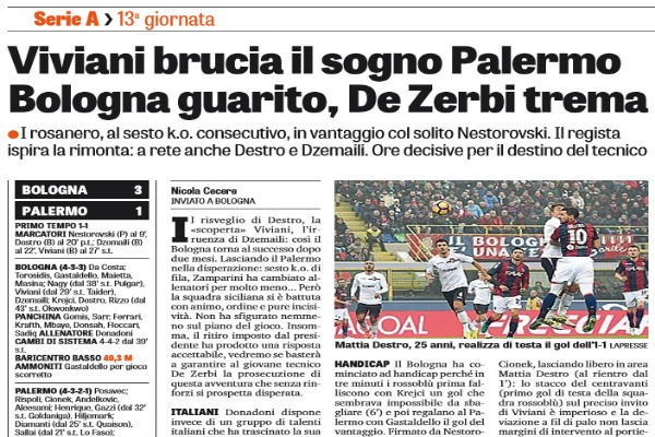 “Il risveglio di Destro, la «scoperta» Viviani, l’irruenza di Dzemaili: così il Bologna torna al successo dopo due mesi. Lasciando il Palermo nella disperazione: sesto k.o. di fila, Zamparini ha cambiato allenatori per molto meno… Però la squadra siciliana si è battuta con animo, ordine e pure incisività. Non ha sfigurato nemmeno sul piano del gioco. Insomma, il ritiro imposto dal presidente ha prodotto una risposta accettabile, vedremo se basterà a garantire al giovane tecnico De Zerbi la prosecuzione di questa avventura che senza rinforzi si prospetta disperata. ITALIANI Donadoni dispone invece di un gruppo di talenti italiani che ha trascinato la sua squadra a un successo attesissimo. Parliamo di Federico Viviani, regista a tutto campo e pure realizzatore del terzo gol, oltre che dell’assist dell’11. Il c.t. Ventura, che ama i giovani, dovrebbe cominciare a seguirlo, si tratta di un classe ‘92… Ma pure Masina (altro ‘94), Rizzo (’92) e lo scalpitante Destro (’91), autore di un magnifico e vincente stacco aereo, hanno giocato da protagonisti, insieme con lo scatenato Dzemaili, cursore e finalizzatore insieme. HANDICAP Il Bologna ha cominciato ad handicap perché in tre minuti i rossoblù prima falliscono con Krejci un gol che sembrava impossibile da sbagliare (6’) e poi regalano al Palermo con Gastaldello il gol del vantaggio. Firmato da Nestorovski (9’), ma moralmente da attribuire a Bruno Henrique, capace di andare a pressare il capitano di Donadoni nonostante partisse in netto svantaggio. Deve restare chiaro che per quanto ostinato e abile sia stato il brasiliano, l’esitazione di Gastaldello nel liberarsi del pallone e il successivo tentativo di dribbling a rientrare sono errori imperdonabili, specie se commessi da un giocatore di esperienza. Un errore (di disattenzione) lo commette anche Cionek, lasciando libero in area Mattia Destro (al rientro dal 1’): lo stacco del centravanti (primo gol di testa della squadra rossoblù) sul preciso invito di Viviani è imperioso e la deviazione a fil di palo non lascia margini di intervento al portiere: 11. Dopo il prologo, ecco un match interessante sino al recupero (il Palermo sull’13 sprecherà con Lo Faso e Cionek due palle gol) che il Bologna fa suo con merito. La svolta a metà ripresa quando un filtrante di Destro, deviato, perviene sulla strada di Dzemaili che insacca dal limite con un micidiale rasoterra mancino. Nemmeno 5’ ed ecco il tris su punizione di Viviani, che corona così la sua esibizione da primattore.”. Questo quanto riportato dall’edizione odierna de “La Gazzetta dello Sport”.