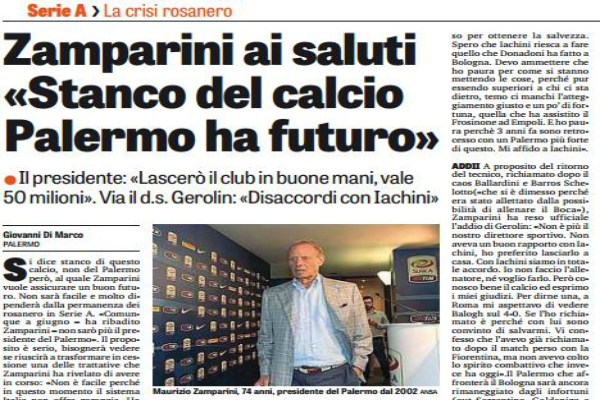 Gazzetta dello Sport: “Zamparini è stanco e si ritira, il suo Palermo vale 50 milioni”