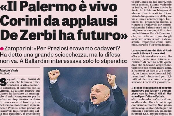 “Segnali di vita. Battiti di cuore che fanno la differenza tra la vita e la morte calcistica. Il Palermo con la vittoria all’ultimo respiro sul Genoa ha lanciato un messaggio al minicampionato per la salvezza. Soprattutto ha detto di non essere defunto prima del tempo, nonostante il presidente Preziosi abbia parlato di «cadaveri fatti resuscitare dalla mia squadra». Il presidente Zamparini si augura che arrivi la spinta per cambiare la stagione e nel frattempo risponde al collega genoano. «Preziosi purtroppo ha detto una str…, si sentivano la vittoria in pugno e se la sono fatta sfuggire. Di sicuro non siamo dei cadaveri – dice il patron È stato un segnale importante, gli dei del calcio non ci hanno voltato le spalle, come sembrava dopo la sconfitta beffa di Firenze. Però la squadra deve capire che ci aspettano solo battaglie come quella di giovedì col Pescara e alla ripresa della sosta con l’Empoli». Cosa ha in più Corini rispetto a De Zerbi e Ballardini? «La prima cosa che gli ho detto è che non possiamo prendere tre gol a partita, perché mica ne faremo sempre 4. Però ha una voglia matta di fare bene e la sta trasmettendo alla squadra. È pacato, riflessivo, ma ha una carica incredibile. Lui crede in questa salvezza». E lei presidente? Ha già cambiato tre allenatori e tre d.s. «Ballardini non credeva nella squadra, voleva soltanto l’aumento dello stipendio. Foschi se n’è andato perché non andava d’accordo con lui. Volevo puntare su due giovani, De Zerbi e Faggiano. Il tecnico farà strada, però deve essere meno integralista, non puoi fare Guardiola senza il Barcellona. Faggiano non lo so perché è andato via, forse ha sentito il grande salto. Ora c’è Simic, è il mio uomo a Palermo. Ma per il mercato ho già movimentato cinque d.s. che lavorano come collaboratori». Come vi muoverete? «Andremo su giocatori pronti, che hanno cuore. La differenza tra noi e squadre come il Chievo e il Genoa sta nel cuore, non nella tecnica. Stiamo vedendo in Italia, se è il caso anche in Serie B. Abbiamo bisogno di almeno due innesti in difesa, visto la lunga assenza di Rajkovic e uno a centrocampo. L’attacco mi preoccupa meno, è rientrato Trajkovski e Nestorovski anche l’altra sera è stato il migliore in campo, è il capitano del futuro. Poi c’è Diamanti che, se utilizzato quando gli avversari sono in calo, è devastante. Impiegato come l’ultimo Del Piero è un’arma letale». La sospensione del fido di Unicredit inficerà il mercato? «No, abbiamo altre risorse. Ho scritto, però, una lettera all’istituto di credito nella quale dico che si devono vergognare, visto che con me in questi anni, a fronte di un fido di 2,5 milioni, ne hanno movimentati 243 prendendo interessi per 1,8 milioni. Senza contare che gestiscono i conti dei giocatori». Il blocco è in seguito al decreto ingiuntivo del Tas per il contenzioso con la Pencil Hill di Mascardi per l’affare Dybala. «Sto subendo un’estorsione, avallata dal Tas che ai tempi era vicino a Blatter. Non posso avere acquistato Dybala per 12 milioni e pagarlo 23, già ne ho sborsati 12,5. Ho un esposto in procura contro Mascardi, gentaglia. Avevamo raggiunto anche un accordo di dilazione di 10 milioni in quattro anni, dei quali 2,5 già pagati. Gli altri 7,5 sono garantiti da fidejussioni, ma loro li volevano subito»”. Questo quanto si legge su “La Gazzetta dello Sport”.