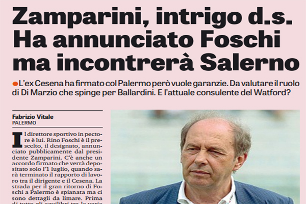 Gazzetta dello Sport: “Zamparini, intrigo d.s. Ha annunciato Foschi ma incontrerà Salerno. L’ex Cesena ha firmato col Palermo però vuole garanzie. Da valutare il ruolo di Di Marzio che spinge per Ballardini. E l’attuale consulente del Watford?”