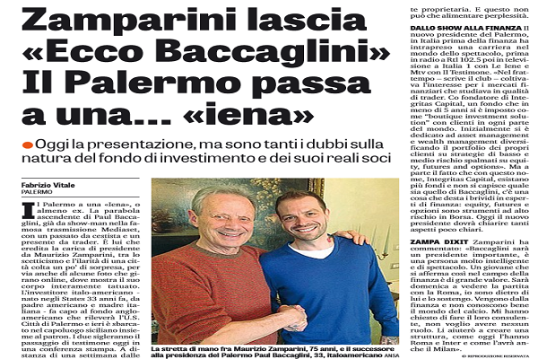 “Il Palermo a una «Iena», o almeno ex. La parabola ascendente di Paul Baccaglini, già da show­man nella famosa trasmissione Mediaset, con un passato da cestista e un presente da trader. È lui che eredita la carica di presidente da Maurizio Zamparini, tra lo scetticismo e l’ilarità di una città colta un po’ di sorpresa, per via anche di alcune foto che girano online, dove mostra il suo corpo interamente tatuato. L’investitore italo­americano ­ nato negli States 33 anni fa, da padre americano e madre italiana ­ fa capo al fondo angloamericano che rileverà l’U.S. Città di Palermo e ieri è sbarcato nel capoluogo siciliano insieme al patron. I due sigleranno il passaggio di testimone oggi in una conferenza stampa. A distanza di una settimana dalle dimissioni di Zamparini, quindi, il Palermo avrà un nuovo presidente. ACCORDO A darne notizia è stata la stessa società con un comunicato che spiega alcuni dettagli dell’accordo contrattuale firmato a casa dell’imprenditore friulano. «Paul ha conosciuto Zamparini l’anno scorso in occasione della trattativa con Cascio. Paul e il suo fondo hanno manifestato, dopo la rinuncia di Cascio, interesse per la acquisizione del Palermo Calcio e la realizzazione degli impianti sportivi. Si è raggiunto un accordo contrattuale, dove il signor Paul, in proprio e quale membro fondatore e rappresentante di Integritas Capital, ha concordato tramite società che lui indicherà entro il 19­417 l’acquisto del 100% delle quote del Palermo Calcio, il cui trasferimento dovrà avvenire entro il 30­4­17. Il Presidente Paul ha assicurato la copertura finanziaria per lo sviluppo del progetto sportivo legato a quello tecnico per la costruzione del nuovo stadio e del centro sportivo. Le ambizioni di Baccaglini sono quelle di portare il Palermo in Europa e Champions». Peccato non si parli mai di cifre e non venga indicata la società che poi diventerà effettivamente proprietaria. E questo non può che alimentare perplessità. DALLO SHOW ALLA FINANZA Il nuovo presidente del Palermo, in Italia prima della finanza ha intrapreso una carriera nel mondo dello spettacolo, prima in radio a Rtl 102.5 poi in televisione a Italia 1 con Le Iene e Mtv con Il Testimone. «Nel frattempo – scrive il club – coltivava l’interesse per i mercati finanziari che studiava in qualità di trader. Co fondatore di Integritas Capital, un fondo che in meno di 5 anni si è imposto come “boutique investment solution” con clienti in ogni parte del mondo. Inizialmente si è dedicato ad asset management e wealth management diversificando il portfolio dei propri clienti su strategie di basso e medio rischio spalmati su equity, futures and options». Ma a parte il fatto che con questo nome, Integritas Capital, esistano più fondi e non si capisce quale sia quello di Baccaglini, c’è una cosa che desta i brividi in esperti di finanza: equity, futures e opzioni sono strumenti ad alto rischio in Borsa. Oggi il nuovo presidente dovrà chiarire tanti aspetti poco chiari. ZAMPA DIXIT Zamparini ha commentato: «Baccaglini sarà un presidente importante, è una persona molto intelligente e di spettacolo. Un giovane che si afferma così nel campo della finanza è di grande valore. Sarà domenica a vedere la partita con la Roma, io sono dietro di lui e lo sostengo. Vengono dalla finanza e non conoscono bene il mondo del calcio. Mi hanno chiesto di fare il loro consulente, non voglio avere nessun ruolo. Li aiuterò a creare una struttura, come oggi l’hanno Roma e Inter e come l’avrà anche il Milan»”. Questo quanto riportato da “La Gazzetta dello Sport”.