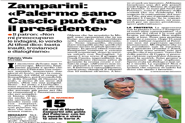 Gazzetta dello Sport: “Zamparini: «Palermo sano. Cascio può fare il presidente»”
