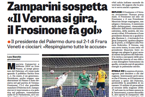 Gazzetta dello Sport: “Zamparini sospetta: «Il Verona si gira, il Frosinone fa gol». Tre le cordate interessate a rilevare il club”