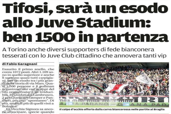 “Esaurito il primo anello, che conta 1.072 posti. Altri 1.109 sono in quello superiore e anche lì saranno quasi tutti carpigiani, per un esodo tra i più grandi della storia del club emiliano. Quasi 1.500 persone e 8 pullman organizzati dai vari gruppi. La Vecchia Signora sa ancora affascinare, specie quando agghindata a festa, cosa che ultimamente le capita spesso. Il soggetto che possa esserci qualche Juventino imbucata c’è, anche perché Carpi, da sempre, è un buon feudo bianconero. Ed è pieno di tifosi col cuore diviso a metà, come il Club Juventus Carpi 1967, ma visto che lo scudetto e già sulle maglie, molti di loro tiferanno biancorosso. Quasi 130 iscritti, che salgono a 200 se si includono i simpatizzanti […]”. Questo quanto si legge su “La Gazzetta di Modena”.