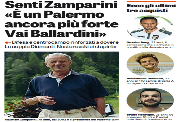Gazzetta dello Sport: “Senti Zamparini: «È un Palermo ancora più forte. Vai Ballardini. Difesa e centrocampo rinforzati a dovere, la coppia Diamanti-Nestorovski ci stupirà»”