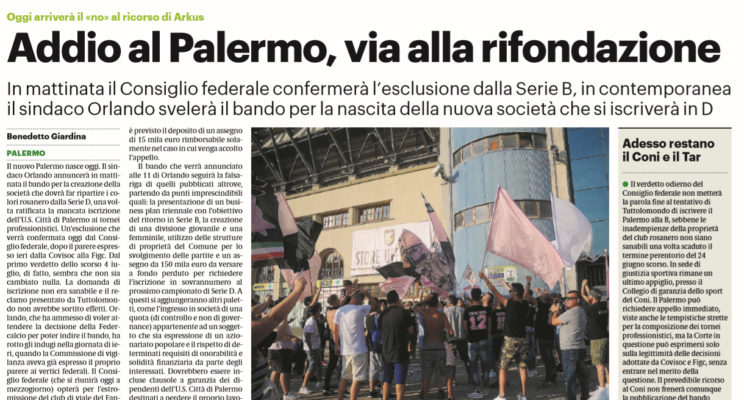 Oggi nascerà il nuovo Palermo. Oggi il Consiglio federale, scrive “Il Giornale di Sicilia” in edicola oggi, annuncerà l’esclusione del club dai campionati professionistici e alle 11, il sindaco Orlando farà una conferenza stampa dove esporrà il bando per la creazione della nuova società che ripartirà dalla Serie D. Il 4 luglio vi è stato il primo verdetto di esclusione e ad oggi non è cambiato nulla perché il ricorso dei Tuttolomondo non aveva delle basi poi così solide. Il sindaco Orlando ha sempre detto di voler attendere la decisione della Federcalcio per poter indire il bando e ieri, quando la Commissione di vigilanza aveva già espresso il proprio parere ai vertici federali, ha rotto gli indugi. Il Consiglio federale (che si riunirà oggi a mezzogiorno) opterà per l’estromissione del club di viale del Fante, una volta ribadito il «no» pronunciato in prima istanza dalla Covisoc . Il verdetto federale e l’atto di «rinascita» del Palermo si sovrapporranno, ma di fatto l’intenzione è quella di non indugiare oltre. Per questioni di opportunità il Comune ha ritenuto corretto non anticipare la decisione della Figc (come invece fatto a Foggia, con l’avviso reso pubblico dopo il parere della Covisoc di otto giorni fa), ma l’esito del ricorso evidentemente non ha fornito alternative. Tuttolomondo aveva presentato nei tempi previsti il reclamo avverso la decisione negativa dell’organo di controllo, ma le numerose lacune evidenziate dalla stessa Covisoc nella domanda di iscrizione non potevano essere colmate in proroga e non sono state colmate. Per l’ammissibilità del ricorso, inoltre, è previsto il deposito di un assegno di 15mila euro rimborsabile solamente nel caso in cui venga accolto l’appello.