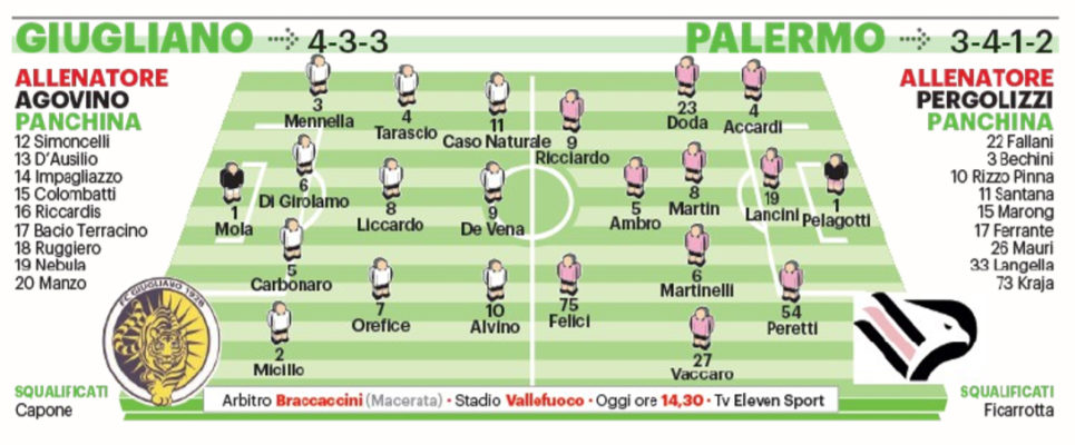 L’edizione odierna de “Il Giornale di Sicilia”, ipotizza la probabile formazione del Palermo, che alle 14.30 sfiderà il Giugliano in occasione della 14^ giornata di campionato. Probabilmente Pergolizzi sceglierà Ambro sulla trequarti, alle spalle del duo Ricciardo-Felici, complice lo stato di Santana non al top della condizione. In alto le possibili scelte del tecnico rosanero.
