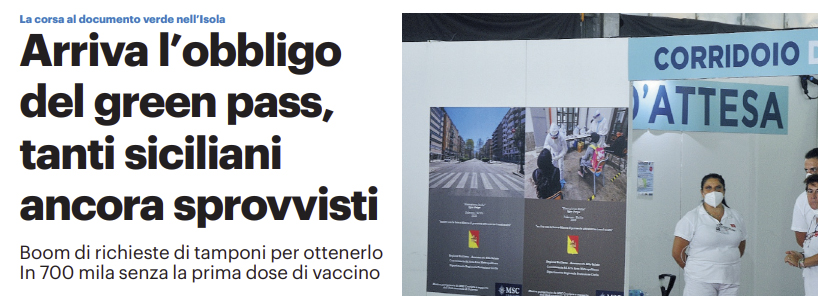 Gds: “Arriva l’obbligo del green pass, tanti siciliani ancora sprovvisti. Boom di richieste di tamponi per ottenerlo”