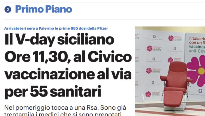 Gds: “Arrivate ieri sera a Palermo le prime 685 dosi della Pfizer. Il V-day siciliano. Ore 11,30, al Civico vaccinazione al via per 55 sanitari”
