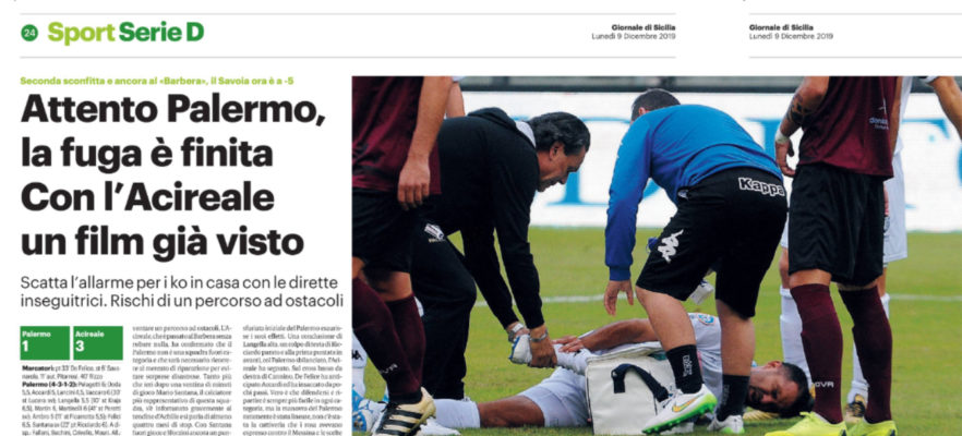 L’edizione odierna del “Giornale di Sicilia” si sofferma sulla fine della fuga del Palermo. L’Acireale è al passato al “Barbera” senza rubare nulla, confermando che il Palermo non è una squadra fuori categoria e che sarà necessario intervenire sul mercato. Santana, il calciatore più rappresentativo, si è infortunato gravemente al tendine d’Achille e si parla di almeno quattro mesi di stop. Adesso serve un attaccante di sicuro affidamento. La partita ha ricalcato quella col Savoia: la manovra del Palermo raramente è stata lineare, non c’è stata la cattiveria che i rosa avevano espresso contro il Messina e le scelte iniziali di Pergolizzi non sono state premiate. Il tecnico ha puntato sul solito modulo 4-3-1-2 ma non si capisce l’impiego di Langella piuttosto che di Kraja in mediana e soprattutto la necessità di insistere su Ambro nel ruolo di trequartista.