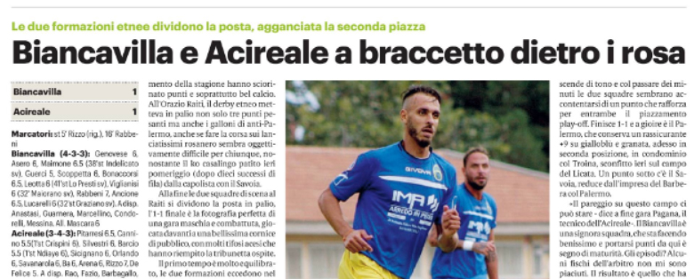L’edizione odierna del “Giornale di Sicilia” analizza il pareggio tra Biancavilla e Acireale. All’Orazio Raiti, il derby etneo metteva in palio non solo tre punti pesanti ma anche i galloni di anti-Palermo, anche se fare la corsa sui lanciatissimi rosanero sembra oggettivamente difficile per chiunque, nonostante il ko casalingo patito ieri pomeriggio (dopo dieci successi di fila) dalla capolista con il Savoia. Alla fine le due squadre di scena al Raiti si dividono la posta in palio, l’1-1 finale è la fotografia perfetta di una gara maschia e combattuta, giocata davanti a una bellissima cornice di pubblico, con molti tifosi acesi che hanno riempito la tribunetta ospite. Il match si sblocca subito, al 5′ della ripresa, con un rigore per i granata, realizzato da Rizzo, glaciale dagli 11 metri nel battere Genovese. La massima punizione era stata concessa per un fallo in area di un difensore del Biancavilla. E allora il Biancavilla torna in carreggiata con Rabbeni, che al 16′ trasforma in oro un assist di Bonaccorsi, firmando il classico gol dell’ex.