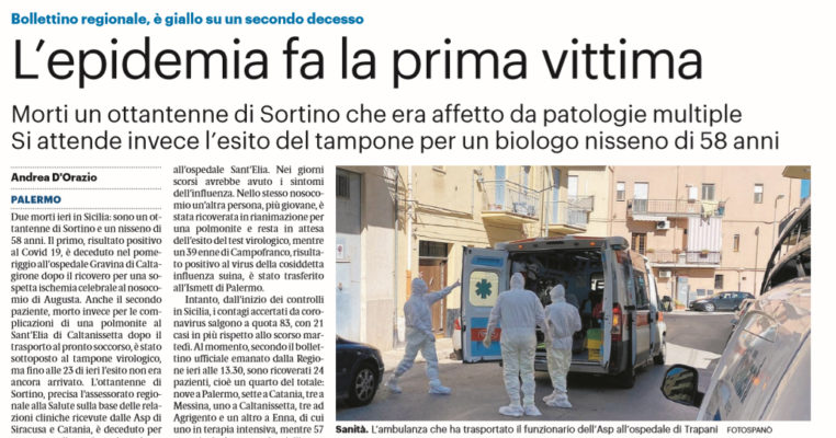 Gds: “Bollettino regionale, è giallo su un secondo decesso. L’epidemia fa la prima vittima in Sicilia”