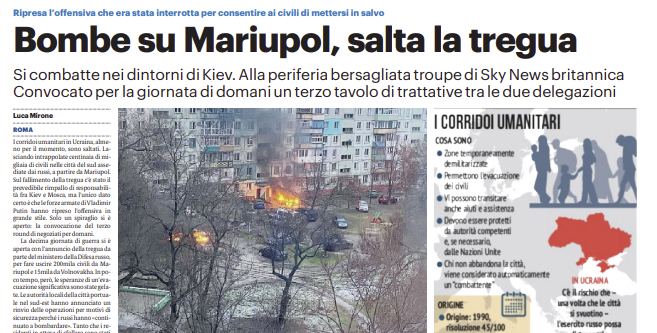 I corridoi umanitari in Ucraina, almeno per il momento, sono saltati. Lasciando intrappolate centinaia di migliaia di civili nelle città del sud assediate dai russi, a partire da Mariupol. Sul fallimento della tregua c’è stato il prevedibile rimpallo di responsabilità fra Kiev e Mosca, ma l’unico dato certo è che le forze armate di Vladimir Putin hanno ripreso l’offensiva in grande stile. Solo un spiraglio si è aperto: la convocazione del terzo round di negoziati per domani.
