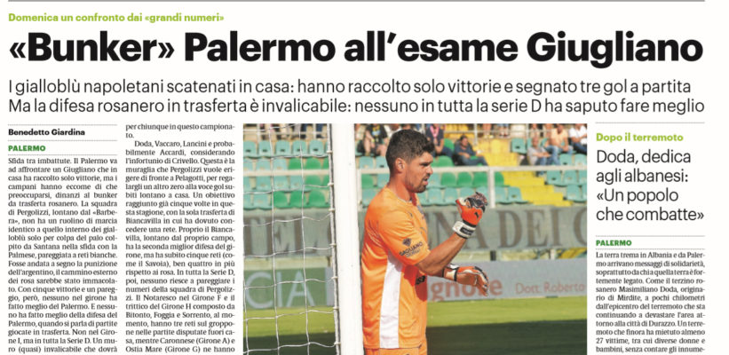 L’edizione odierna del “Giornale di Sicilia” si sofferma sulla sfida tra Giugliano e Palermo. In casa, la squadra campana ha raccolto solo vittorie, ma adesso devono preoccuparsi contro il bunker Palermo. Nessuno ha fatto meglio dei rosa fuori casa, con cinque vittorie e un pareggio. Segnare al Palermo in formato trasferta si sta dimostrando un’impresa impossibile per chiunque in questo campionato. Doda, Vaccaro, Lancini e probabilmente Accardi, considerando l’infortunio di Crivello. Questa è la muraglia che Pergolizzi vuole erigere di fronte a Pelagotti, per regalargli un altro zero alla voce gol subiti lontano a casa. Un obiettivo raggiunto già cinque volte in questa stagione, con la sola trasferta di Biancavilla in cui ha dovuto concedere una rete. In tutta la Serie D, poi, nessuno riesce a pareggiare i numeri della squadra di Pergolizzi. Tuttavia, i campani vantano anche il secondo miglior attacco interno del girone. Diciotto reti contro le diciannove del Palermo. Il Palermo è chiamato alla prova più difficile di tutta la stagione.