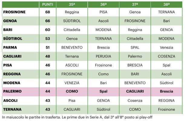 Nelle ultime tre i rosa hanno affrontato Cosenza, Venezia e Benevento, tre squadre nei bassifondi della graduatoria: appena due i punti conquistati, con altrettanti pareggi al Barbera in mezzo la sconfitta del Penzo. Più del risultato e la prestazione a fotografare le difficolta del Palermo: nei match casalinghi il migliore è stato Pigliacelli e l’attacco ha stentato, a Venezia l’intero undici è naufragato dinanzi alle ripartenze avversarie e le reti sono arrivate su pasticci difensivi, i rosa non hanno approfittato delle difficoltà delle altre contendenti playoff: ma continuano a osservarle da vicino: erano noni dopo la splendida prestazione di Pisa e tali rimangono dopo quella assai meno brillante con il Benevento, ma ora bisognerà ritrovare la vittoria. Il calendario dice Como e Cagliari fuori casa. Spal e Brescia dentro: più difficili le prime e più semplici le seconde, ma senza un Palermo arrembante guardare la classifica delle altre servirà a poco.