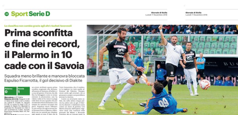 L’edizione odierna del “Giornale di Sicilia” analizza la sconfitta del Palermo contro il Savoia. Sarebbe un errore attribuire tutto alla sfortuna, all’arbitro o cose del genere. Il Savoia non ha rubato nulla e ha messo la piaga sulle ferite di una squadra che non ha sempre convinto sul piano del gioco. Il dato che fa più male è quello delle conclusioni a rete del Palermo, che nelle cinque precedenti gare interne aveva segnato 18 gol. Con Martin braccato dall’esperto Osuji e Ricciardo stritolato dai tre centrali ospiti, la cavalleria leggera del Palermo s’è persa nella convinzione che fosse possibile giocare ognuno per i fatti propri. I rosa si sono incaponiti in frequenti e inconsistenti azioni personali che non hanno portato a nulla. Al 26′, Ficarrotta ha scalciato a gioco fermo Oyewale meritandosi il cartellino rosso. Al 31’ Lancini non è stato perfetto sul lungo lancio di Gatto, Diakite è entrato in area da sinistra ed ha segnato in diagonale. Questo è un campanello d’allarme che va ascoltato, la posta in palio è troppo alta per far finta che sia stata soltanto una giornata storta.