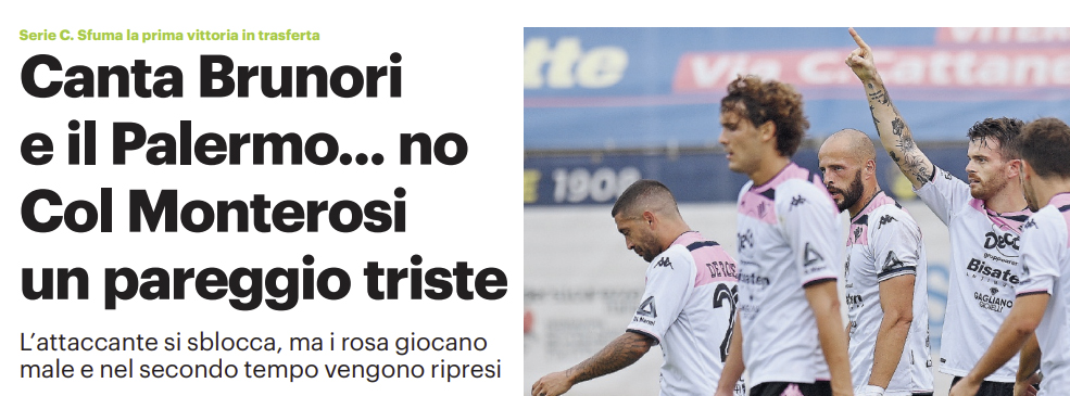 Si sblocca Brunori che segna la sua prima rete stagionale, ma non basta. Un brutto Palermo pareggia a Viterbo sul campo del modesto Monterosi e perde una favorevolissima occasione per vincere la prima gara esterna del campionato, per avvicinarsi alle posizioni di vetta e soprattutto per dare un segnale forte al torneo di Serie C.