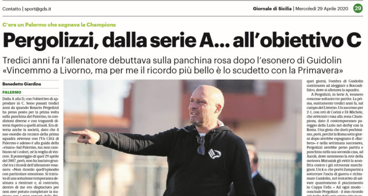 L’edizione odierna del “Giornale di Sicilia” ricorda il debutto di Rosario Pergolizzi sulla panchina del Palermo, datato 29 aprile 2007 «Non ricordo quell’episodio con particolare emozione. Si trattava di una soluzione temporanea destinata a rientrare e, al contrario, dentro di me ero dispiaciuto per non aver potuto completare la stagione con i miei ragazzi della Primavera proiettati verso le fasi finali». Era un Palermo che sognava la Champions League, ma dilaniato dai conflitti tra Guidolin e Zamparini. Al posto del tecnico veneto, esonerato, il patron scelse il suo vice Renzo Gobbo, a coadiuvare Pergolizzi promosso dalla Pirmavera: «Per via del grande amore per il Palermo ed il profondo rispetto per la società ho chiaramente accettato senza problemi la scelta aziendale». La squadra rosanero vinse a Livorno 1-2, con reti di Corini e Di Michele. Una gioia che durò pochissimo, però, perché la Roma sette giorni dopo avrebbe espugnato il «Barbera» e nella settimana successiva, Pergolizzi avrebbe perso partita e panchina nella sua seconda casa, ad Ascoli, dove nemmeno la rete della meteora Matusiak gli evitò la sconfitta contro i già retrocessi marchigiani. Un k.o. che portò Zamparini a sotterrare l’ascia di guerra e richiamare Guidolin, nel tentativo di salvare quantomeno il piazzamento in Coppa Uefa: «Ad ogni modo – conclude Pergolizzi – il mio ricordo più bello della mia prima vita in rosanero è stato senza dubbio lo scudetto del 2009 (con la Primavera, ndr)». Dal sogno Champions si è passati all’obiettivo Serie C.