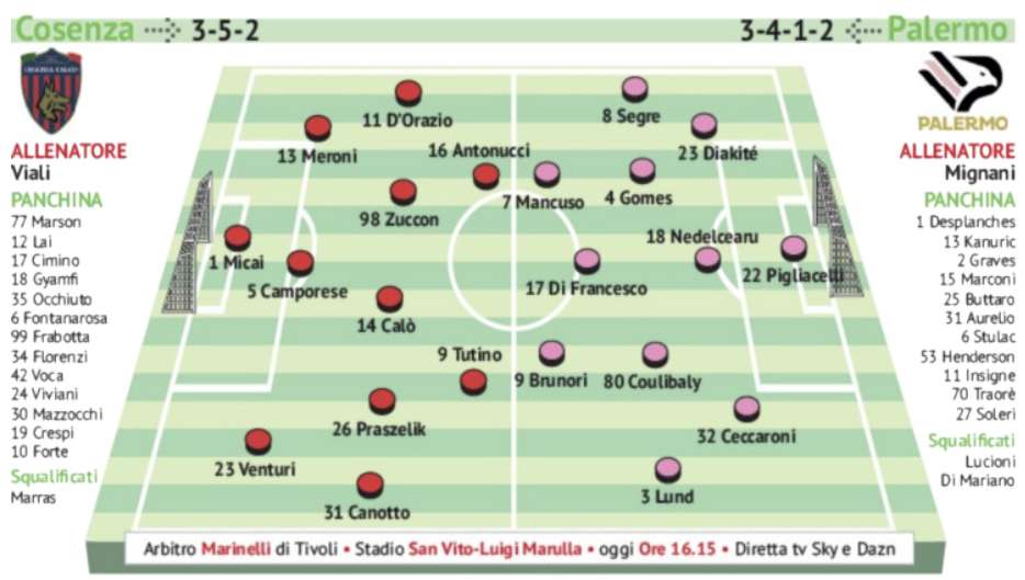 Ma l’ex del Frosinone sembra ai margini degli schemi di Mignani, a parte il fatto che schierare un quarto attaccante sarebbe rischioso. Poiché non c’è neppure Vasic, il favorito per giocare esterno a destra sembra essere Segre, in base alle prove della settimana. Segre ha giocato spezzoni da esterno senza mai incantare, oggi dovrà reinventarsi in una posizione non sua lasciando il posto a Coulibaly, leggermente favorito su Henderson e Stulac. Inutile dire che il ruolo di Lucioni sarà ripreso da Nedelcearu e, benché in settimana Mignani abbia «aperto» al giovane Desplanches, Pigliacelli dovrebbe difendere anche oggi la porta rosanero.