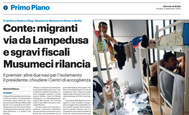 L’edizione odierna del “Giornale di Sicilia” si sofferma sul caos migranti. L’hotspot di Lampedusa verrà svuotato, ma non chiuso. E ai lampedusani arriveranno sgravi fiscali per compensare i danni subiti per effetto degli sbarchi. E’ questo il risultato del vertice Conte-Musumeci-Martello. «Restano diversità di vedute con il governo nazionale, che ha proposto alcune iniziative ma slegate da un calendario, al di fuori di scadenze precise» è la sintesi che Musumeci ha dettato alle agenzie uscendo da Palazzo Chigi.