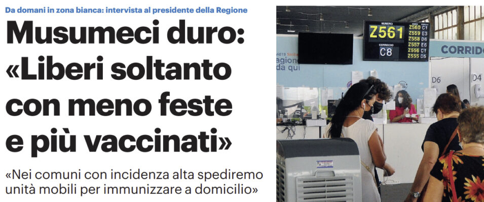 Gds: “Da domani in zona bianca. Musumeci duro «Liberi soltanto con meno feste e più vaccinati»”