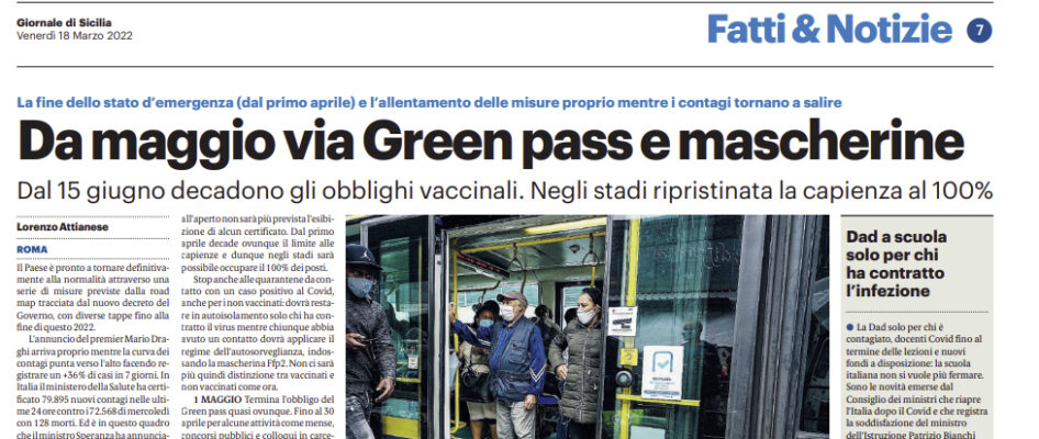 L’edizione odierna de “Il Giornale di Sicilia” si sofferma sull’allentamento delle norme anti-covid a partire da maggio quando verranno abolite mascherine e green pass.