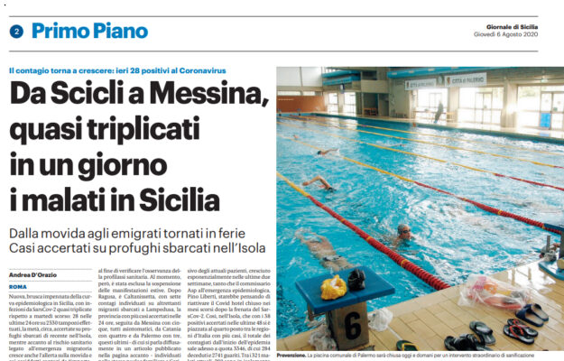 L’edizione odierna del “Giornale di Sicilia” parla della situazione Coronavirus. Nuova, brusca impennata della curva epidemiologica in Sicilia, con infezioni da SarsCov-2 quasi triplicate rispetto a martedì scorso: 28 nelle ultime 24 ore su 2330 tamponi effettuati, la metà, circa, accertate su profughi sbarcati di recente nell’Isola – scrive il quotidiano, mentre accanto al rischio sanitario legato all’emergenza migratoria cresce anche l’allerta sulla movida e sui cosiddetti contagi da “import azione”, individuati tra i turisti stranieri o fra i siciliani domiciliati all’estero tornati nell’Isola per le vacanze estive.