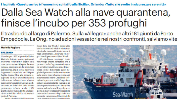 L’edizione odierna del “Giornale di Sicilia” si sofferma sul trasbordo di 353 migranti dalla Sea Watch 4 alla nave quarantena “Allegra”.