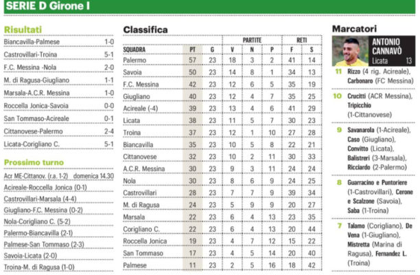 L’edizione odierna del “Giornale di Sicilia” si sofferma sulla 24a giornata del girone I di Serie D, che vedrà il Palermo ospitare tra le mura amiche del “Barbera” il Biancavilla di Mascara. In foto, il programma e la classifica aggiornata del campionato.
