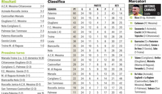 L’edizione odierna del “Giornale di Sicilia” si sofferma sulla 25a giornata del girone I di Serie D, che vedrà il Palermo fare visita al Licata. In foto, il programma e la classifica aggiornata del campionato.