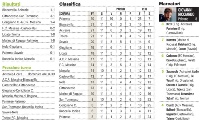 L’edizione odierna del “Giornale di Sicilia” si sofferma sulla dodicesima giornata del girone I di Serie D, che vedrà il Palermo far visita alla Palmese. In foto, il programma e la classifica aggiornata.