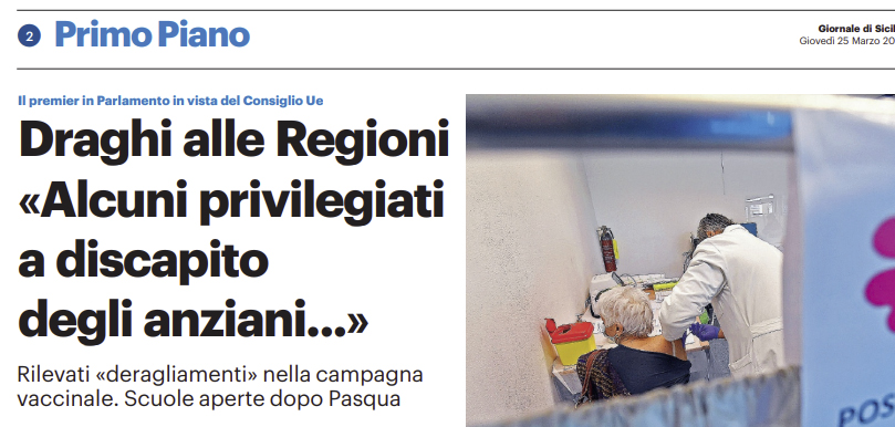 L’edizione odierna del “Giornale di Sicilia” si sofferma sulle parole del premier Draghi, che nutrono l’intento di porre fine ai deragliamenti che hanno coinvolto le Regioni nella campagna vaccinale.